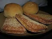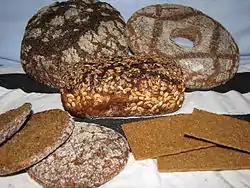 ![]() خمس أنواع من خبز الشيلم الفنلندي (من أعلى إلى أسفل/من اليسار إلى اليمين): ليمبو، ريكاليبا، لواف، ريسومييس و هبنكوربو | |