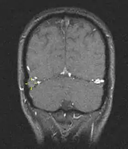 ![]() خثار الجيب الوريدي المخي (الإشارات الصفراء) كما يظهر في تصوير بالرنين المغناطيسي خثار الجيب الوريدي المخي (الإشارات الصفراء) كما يظهر في تصوير بالرنين المغناطيسي | |