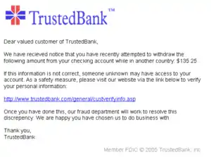- يستهدف المخادعون عملاء البنوك وخدمات الدفع عبر الإنترنت. تم استخدام رسائل البريد الإلكتروني، المفترض أنها من مصلحة الإيرادات الداخلية ، لجمع بيانات حساسة من دافعي الضرائب الأمريكيين.[63] في حين تم إرسال أول هذه الأمثلة دون تمييز على أمل أن يستقبل البعض عملاء بنك أو خدمة معينة، فقد أظهرت الأبحاث الحديثة أن المخادعين قد يكونون من حيث المبدأ قادرين على تحديد البنوك التي يمكن أن يستخدمها الضحايا المحتملين، واستهداف رسائل البريد الإلكتروني الزائفة وفقًا لذلك.[64]