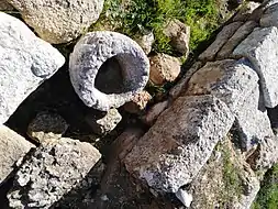 والى الشمال من المغارة، اكتشفت جدران مبنية بحجارة ضخمة بعضها مشذب ويبدو ان هذه الجدران مع قواعد الاقواس تشكل جزءاً من بناء كبير ومما يؤكد ذلك العثور على اجزاء مبعثرة من الفريسكو الملون ويعتقد ان البناء يعود إلى الفترة البيزنطية والاموية. كما تم الكشف عن عدد من الاواني والاسرجة الفخارية وقطع النقود النحاسية.[4]
