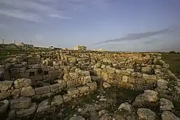 واكتشف فيها ارضيات فسيفسائية في الجزء الغربي من الموقع,[3]وتتكون بعض الارضيات من طبقتي فسيفساء احداهما ذات حبيبات حجم كبير وبيضاء اللون والاخرى صغيرة الحبيبات وملونة وتشكل زخارف نباتية وهندسية ذات دلالات فنية ودينية، وتشكل هذه الارضيات مع ما اكتشف من جدران ارضيات لغرف كانت جزءاً من كنيسة تعود إلى العصر البيزنطي والتي دمرت بسبب الزلزال الذي حدث عام 748م.