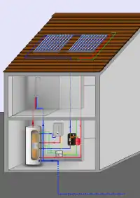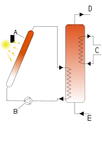 في نظام تسخين المياه بالطاقة الشمسية، يخزن خزان المياه الساخنة الذي يعمل بالطاقة الشمسية الحرارة من مجمعات الطاقة الشمسية الحرارية. ويحتوي الخزان على مبادل حراري مدمج يستخدم لتسخين المياه المنزلية الباردة. وتعاني هذه الخزانات من نفس المشكلات المتعلقة برواسب الحجر الجيري والتآكل مثل الخزانات التي لا تعمل بالطاقة الحرارية، والتي تقلل من كفاءة المبادلات الحرارية.