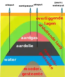 في الشكل 2: الطبقة الأرضية الصفراء (2)و(3) طبقة مسامية أمكن للنفط تخللها والارتفاع فيها. ثم تراكمت عليها طبقة غير مسامية عبر زمن طويل ( مئات ملايين السنين ) واحتجزتها . وفي حالتنا هذه حدث تصدع في طبقات الأرض عبر خط التصدع الأسود المائل، فاحتـُجز جزء من النفط والغاز في (5)(أحمر) . ولكن التسرب وصل إيضا إلى الطبقة الصفراء ( 6)، فالطبقة الأرضية الصفراء "متشربة" بالنفط، وهي مقاربة للوصول إلى السطح كما نرى.