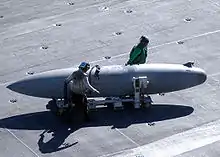 خزان وقود خارجي قابل للإسقاط وهو ينقل على سطح حاملة طائرات
