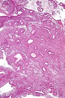 ![]() صورة مجهرية توضح خزعة بطانة الرحم لعينة تُشير إلى فرط تنسج بطانة الرحم حيث نسبة الغدة إلى السدي كما هي لكن الغدد لها شكل غير منتظم و/أو مُتسعة. صبغة H&E | |
