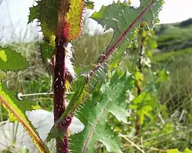 نبات عشبي ثنائي الحول. الأوراق متموضعة مباشرة على الساق (دون عنيقة)، ولها أشواك صغيرة على جانبيها وفي الوسط.