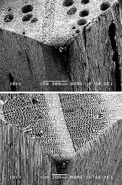 تتسم بنية الأخشاب الصلبة بأنها أكثر تعقيدًا من الأخشاب اللينة. والسمة الرئيسية المسيطرة التي تميز "الأخشاب الصلبة" عن الأخشاب اللينة هي تواجد المسام، أو الأوعية.[1] ويمكن أن تتميز تلك الأوعية بالتنوع الشديد في الحجم وشكل لوحات الثقب (بسيطة، سقالية، شبكية، ثقبية)، وهيكل جدار الخلية، مثل السمك اللولبي.