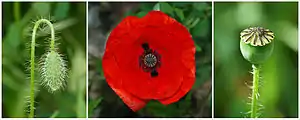 المراحل الثلاثة في حياة زهرة الخشخاش المنثور: البرعمة، الإزهار، المحفظة.