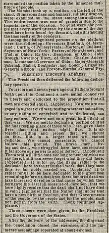بعد فترة قصيرة من إلقاء ايفريت خطابه والذي لاقى استحسانًا جيدًا، تحدث لينكولن لعدة دقائق قليلة.[14] من خلال "بعض التعليقات الملائمة"، تمكن لينكولن من تلخيص رؤيته عن الحرب في عشرة جمل فقط. وعلى الرغم من الأهمية التاريخية لخطاب لينكولن، فقد اختلف العلماء المعاصرين في صياغته الحرفية، وكذلك النُسخ المعاصرة التي تم نشرها في تقارير الصُحف عن الحَدَث، وحتى النُسخ المكتوبة بخط يد لينكولن نفسه تختلف عن بعضها في الصياغة، والترقيم، والبناء.[15][16] النسخة بليس هي واحدة من ما سبق ذكرهم دُونت بصيغة جيدة بعدالخطاب كمعروفٍ لصديق وتُعد من قبل الكثيرين النص النموذجي.[17] ومع ذلك يختلف نص هذه النسخة عن النُسخ المكتوبة التي أعدها لينكولن قبل وبعد خطابه.ولكنها النسخة الأخيرة التي كتبها لينكولن والأخيرة التي تحمل توقيعه.[17]