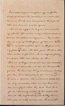 "واقفًا أسفل هذه السماء الهادئة، ناظرًا إلى هذه المساحات الفسيحة التي تستريح من جهود العام المنحسر، جبال الأليجينيز الشاهقة شامخة أمامنا بصمت، وقبور أخوتنا أسفل أقدامنا، وبترددٍ أرفع صوتي الواهن لشق صمت الرب والطبيعة البليغ. بلا شك يجب أن أُؤدي ما نُسب إليّ من واجب؛ أدعوكم أن تمنحوني تسامحكم وتعاطفكم."[12]