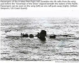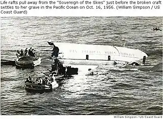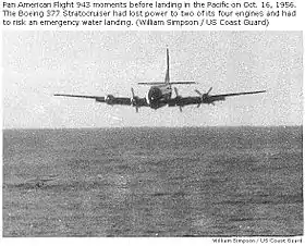 ![]() خطوط بان أمريكان العالمية الرحلة 943 قبل الهبوط علي المياه في صباح 16 أكتوبر 1956 ألتقطت هذه الصورة من أحد أفراد خفر السواحل الأمريكي ويليام سيمبسون خطوط بان أمريكان العالمية الرحلة 943 قبل الهبوط علي المياه في صباح 16 أكتوبر 1956 ألتقطت هذه الصورة من أحد أفراد خفر السواحل الأمريكي ويليام سيمبسون | |
