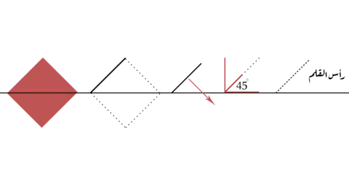 - الزاوية: لرسم الحرف، يصنع رأس القلم بدايةً زاوية تتراوح بين 45 و90 درجة مع السطر، وبتطبيق المسكة الصحيحة تُعطى الزاوية الصحيحة.