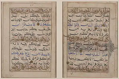 صفحتان من مصحف كتب بالخط البهاري (الصفحة اليمنى: الآيات 2-8 من سورة الكهف، الصفحة اليسرى: الآيات 67-70 من سورة الإسراء)