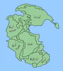 | 300 Ma | ![]() بانجيا قبل تكسرها. تشكل القارة العظمى بانجيا وتستمر لمدة 120 مليون عام; وهذه أخر مرة تندمج فيها قارات الأرض إلى قارة واحدة. إن تطور البيض السلوي amniotic egg جعلت من السلويات Amniota ترتقي إلى الزواحف, التي تستطيع التكاثر في اليابسة. تطور الحشرات قدرتها في الطيران، ويتضمن ذلك عدد من الرتب المختلفة (على سبيل المثال بالايوديكتوبتيرا Palaeodictyoptera, وميغاسيكوبتيرا Megasecoptera, وديافانوبتيروديا Diaphanopterodea, وبروتورتوبتيرا Protorthoptera). لا تزال اليعاسيب تشبه العديد من هذه الحشرات الأولية. غطت غابات واسعة من شعبة أرجل الذئبيات ونباتات ذيول الحصان وسراخس الأشجار اليابسة; وعندما تموت هذه النباتات وتتحلل فأنها تبدأ بالتحول إلى فحم حجري وزيت. عاريات البذور بدأت بالانتشار بشكل واسع. الظهور الأول للنباتات السيكادية, وهي نباتات تشبه النخيل. |