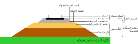 كما يُشير مصطلح الطريق الدائم إلى خط السكة الحديد المكون من الأرضية المجهزة وألواح تثبيت القضبان عليها والقضبان ؛ بالإضافة إلى مجاري تسريب المياه (لابعادها عن خط القطار) والبنايات الأخرى على جانبيه مثل الأسوار وغيرها.