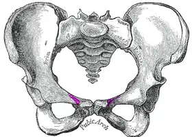 ![]() حوض الأنثى. الخط العانِي يظهر باللون الأرجواني على جانب الخط المُنصف لقاع الفُتحة المركزية. | |