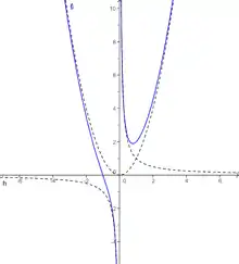 لها نهاية +∞ عندما x → 0+، ومع ذلك فإن لها خط تقارب رأسي عند x = 0، ذلك مع أن ƒ(0) = 5، مما يعني أن رسم الدالة يتقاطع مع خط التقارب الرأسي تقاطعًا وحيدًا عند النقطة (0,5)، ومن الجدير بالذكر أن رسم أي دالة لا يمكن أن يتقاطع مع محور تقارب رأسي في أكثر من نقطة وحيدة.