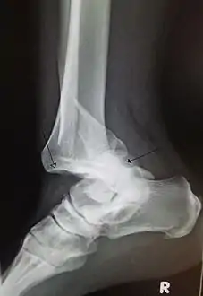 ![]() انخلاع رضحى في المفصل الرصغى القصبى (tibiotarsal joint) للكعب مع كسر في عظمة الشظية بعيدا عن المفصل. السهم المفتوح يشير إلى عظمة القصبةبينما السهم المغلق يشير إلى عظم الكاحل. انخلاع رضحى في المفصل الرصغى القصبى (tibiotarsal joint) للكعب مع كسر في عظمة الشظية بعيدا عن المفصل. السهم المفتوح يشير إلى عظمة القصبةبينما السهم المغلق يشير إلى عظم الكاحل. | |