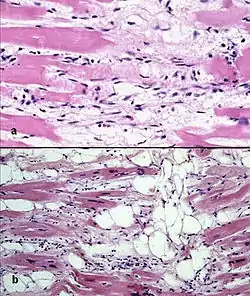 ![]() صورة نسيجية لقلب مريض بالـARVD. صورة نسيجية لقلب مريض بالـARVD. | |
