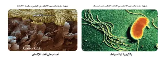 و تسبب الحركات السوطية للأهداب في تجويف الأنف والمجاري التنفسية السفلى حركة طبقة المخاط الموجودة بها بسرعة 1 سم / دقيقة نحو البلعوم. وتنظف المجاري التنفسية بهذه الطريقة من المخاط ومن أية مواد [44] أخرى تتعلق بها. وتسبب الأهداب في أنبوبة الرحم ( قناة فالوب ) حركة بطيئة للسائل من فوهته نحو تجويف الرحم. وتنقل حركة السائل هذه البويضة من مبيض الأنثى إلى رحمها.