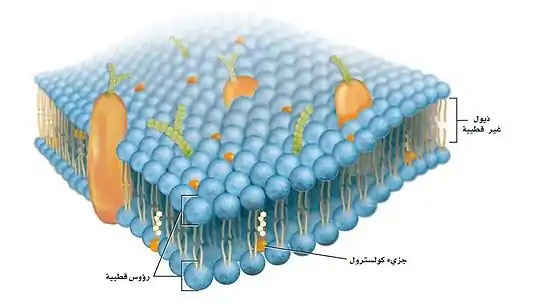 لاحظ شكل الطبقة المزدوجة من الدهون المُفسفَرة سترى أن كل طبقة دهون مُفسفَرة رُسمَت على شكل رأس له ذيلان فيما يعرف باسم الطبقة الشحمية المزدوجة؛ حيث تُكوِّن مجموعة الفوسفات رأسًا قطبيًّا في كل طبقة من الدهون المُفسفَرة. وينجذب الرأس القطبي إلى الماء، لأن الماء قطبي أيضًا. أما ذيلا الأحماض الدهنية فهما غير قطبيان ويتنافران مع الماء. وهو غشاء رقيق من الشحميات بسمك جزيئين يتواصل حول كل سطح الخلية. وتنتشر داخل هذه الطبقة الشحمية جزيئات بروتين كروية الشكل. وتتكون الطبقة الشحمية المزدوجة من الشحميات الفسفورية والكولسترول بصورة تامة. وأحد أقسام جزيء الشحميات الفسفورية والكوليسترول ذائب بالماء أي أنه أليف للماء hydrophilic، بينما يكون قسمه الآخر كاره للماء hydrophobic.[7] فجذر فسفات الشحم الفوسفاتي أليف للماء بينما الجذر الشحمي للحمض الدهني ذائب بالدهن. ويحوي الكولسترول جذر هيدروكسيل ذائب بالماء ونواة ستيرويدية ذائبة بالدهن. ولأن الماء يطرد الأجزاء الكارهة للماء لهذين الجزيئين بينما هي تجاذب مع بعضها البعض بصورة متبادلة؛ فلذلك تكون لها نزعة للاصطفاف كما في الصورة السابقة، وتكون بتماس مع الماء المحيط بالغشاء.[8]