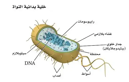 | نمط نواة (خلية) | منطقة شبيهة بالنواة; لا وجود لنواة حقيقية | نواة حقيقية ذات غشاء مضاعف |