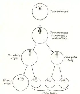 يحدث الطور الأول من الانقسام الاختزالي الأول وحسب في أثناء مرحلة نمو الخلية البيضية، بينما تنجز بقية الأطوار بعد الإخصاب. في نهاية هذا الانقسام، تتحول الخلية البيضية من الدرجة الأولى إلى خلية بيضية من الدرجة الثانية ذات العدد (ن) من الصبغيات، وكرية قطبية أولى ذات العدد (ن) من الصبغيات. تتنكس الخلية البيضية من الدرجة الثانية وتزول إذا لم يحدث الإخصاب، أما إذا أخصبت فإنها تخضع للانقسام الاختزالي الثاني، لتعطي خليتين؛ إحداهما: كبيرة هي أرومة البيضة، والثانية: صغيرة هي الكريه القطبية الثانية. تطرح الكرية القطبية الأولى عند الثدييات لدى الإباضة، ويؤدي دخول النطفة إلى الخلية البيضية من الدرجة الثانية إلى طرح الكرية القطبية الثانية، ويصبح انصهار نوى العروسين ممكناً، ثم تزداد فعالية الاستقلاب فيتشكل المح والشحميات، والشحميات الفوسفورية، والبروتينات والبروتينات الفوسفورية.
