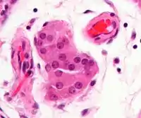 تتميز الخلايا البينية بنواة حمضية، فاتحة اللون، مكورة ودائرية. يحيط بها سيتوبلازم مليء بالشبكات الإندوبلازمية الملساء والميتوكوندريا. وبكميات أقل يوجد في السيتوبلازما ايضاً فجوات دهنية وكريستالات.[2]