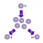2. بعض تلك الخلايا تي الناشئة تتحول إلى خلية تي مساعدة (E) وتقوم بوظيفة خلية تي مساعدة ( إما تنتج سيتوكين (بروتينات خاصة) لتعليم الخلايا أو تتحول إلى خلية تي قاتلة cytotoxic T cell ).