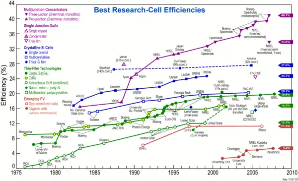 ابتكر سبكترولاب Spectrolab ما يسمى خلية شمسية مركزة concentrator solar cell تحول الطاقة الشمسية إلى كهرباء بكفاءة 7و40 % وهو يعتبر رقم قياسي عالمي ويبلغ ثمنه نحو 3 دولار لكل واط وتبلغ كلفة الطاقة الكهربائية التي يقدما من 8 إلى 10 سنت لكل كيلوواط ساعي . وكانت كفاءة الخلايا الضوئية متعددة الوصلات خلال الثمانينيات من القرن الماضي قد وصلت 16 % فقط، ثم اخترقت كفاءتها حد ال % 30 عام 1994 .[1]