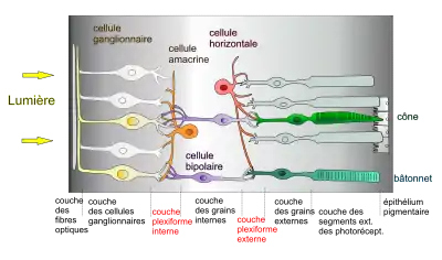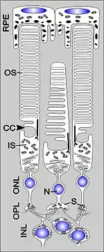 تتكون كل من الخلايا العصوية والخلايا المخروطية من جسم الخلية وسينابس وجزء متخصص للرؤية : الجزئين الداخلي والخارجي. في الجزء الخارجي OS يجري توصيل إشارة الرؤية عن طريق جزيئات رؤية اللون . وتتكون تلك الجزيئات البصرية من مجموعة من حاملات اللون (ريتينال) مرتبطة بـ غليكوبروتين (أوبسين). وتوجد تلك الجزيئات موزعة في عدد كبير (أكثر من 1000 ) من الأقراص الغشائية في الشبكية . الأجزاء الخارجية للعصيان تكون طويلة وذات مقطع صغير ويغطي كل منها نسيج غطائي يحمل الاصباغ RPE . يرتبط الجزء الخارجي OS عن طريق هدب CC بالجزء العصوي الداخلي للخلية المحتوي على متقدرات الخلية، ثم يأتي جزء الخلية المحتوي على النواة N وتنتهي من أسفل بمحور عصبي و تشابك عصبي OPL . هنا توجد التشابكات العصبية متعددة في أشكال حزمية أو مسطحة وتتصل المنطقة النشطة للتشابك العصبي INL .
