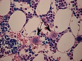 ![]() خليتي كبيرة النواة في نخاع العظم مؤشرتان بالسهم، ويلاحظ كبر حجم الخلية والنواة. | |