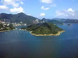 بالنظر إلى جزيرة الأوسط، قبالة جزيرة هونغ كونغ (يسار) بين خليج المياه العميقة وخليج الصدة .
