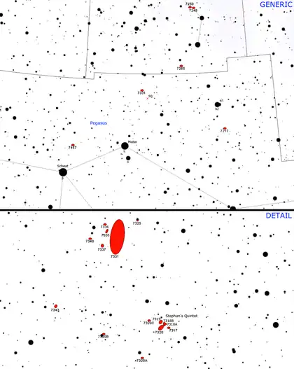 موقع الخماسية : فوق معلمة بصليب أحمر، تحت :موقع الخماسية بالنسبة لمجرة NGC 7331 ومجموعتها.