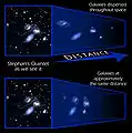قامت الراصد بتعيين مقدار الانزياح الأحمر لكل مجرة في الخماسية وتبين أن المجرة إن جي سي 7320 (تحتية في الصورة) لها انزياح أحمر قليل (790 كيلومتر في الثانية) بينما الانزياح الأحمر للأربعة مجرات الأخرى تُبدي انزياحا احمرا نحو 6600 كيلومتر في الثانية. ونظرا لأن الانزياح الأحمر دالة للمسافة بين المجرات وبيننا فنستخلص من ذلك أن المجرة إن جي سي 7320 أقرب إلينا [1] ويحدد انزياحهاالأحمر بعدها عنا بنحو ~39 مليون سنة ضوئية فقط [1] في حين أن الأربعة الأخرين على بعد 210 - 340 مليون سنة ضوئية منا.