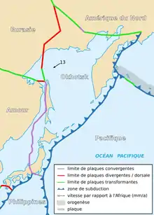 يقع غرق اندساس صفيحة المحيط الهادئ تحت صفيحة أوخوتسك في أصل خندق ويولد نشاطًا بركانيًا شديدًا عند حافة الصفيحة التي تغرق تحتها والتي تكون في أصل جزر الكوريل .
