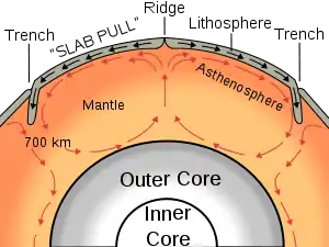 وتتحرك الصفائح معًا على طول حدود الصفائح التقاربية من خلال معدلات مختلفة من مليمترات قليلة حتى عشرة سنتيمترات في العام. وتعدّ الخندق الموضع الذي يبدأ فيه هبوط بلاطي في النزول أسفل بلاطة قشرة أرضية أخرى. وتعدّ الخنادق موازية للجزر القوسية البركانية, وتبعد نحو 200 كـم (120 ميل) من القوس البركاني. وتمتد الخنادق المحيطية في الواقع نحو 3 الي 4 كم أسفل مستوى قاع البحر المحيط بها. وأكبر عمق محيطي قِيس بالموجات الصوتية هو تشالينجر ديب في خندق ماريانا بعمق يبلغ 10,911 م (35,797 قدم) أسفل سطح البحر. وتتحرك القشرة الأرضية المحيطية إلى داخل الخنادق بمعدل عالمي يبلغ .[1]