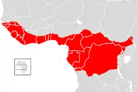 ![]() الموطن الحالي لِخنازير الأنهار الحمراء | |