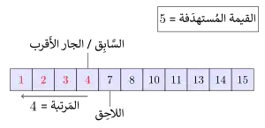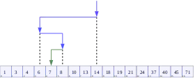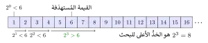 ![]() تصوُر خوارزمية البحث الثنائي حيث 7 هو القيمة المستهدفة | |