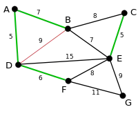هناك طريقين بنفس الوزن 7 لذلك تم اختيار AB كما تم تعليم DB بالأحمر لأن هناك طريق بين B و D لذلك كان سيكون هناك دائرة إذا تم اخيار DB |