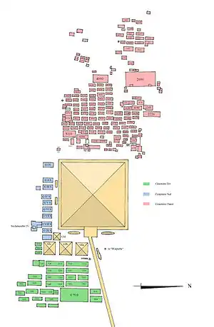 كما تم في عهد خوفو انشاء منطقتي قبور على الناحية الشرقية والناحية الغربية . يوجد على الناحية الشرقية ثلاثة اهرامات صغيرة للملكات زوجات خوفو. الهرم الجنوبي منها (G1c) كان مخصصا "للزوجة الكبرى" واسمها "حنوتسن " ، والهرم الأوسط (G1b) لزوجته "مريتيتس" ، وكان يعتقد أن الهرم الثالث الشمالي (G1a) كان مخصصا لطقوس دينية، إلى أن اكتشف عالم الآثار الألماني "راينر ستادلمان" علاقة بينه وبين المقبرة (G 7000x) لأم خوفو الملكة حتب حرس. وهرم رابع أصغر يعتبر أن كان للطقوس الدينية في عهد خوفو.