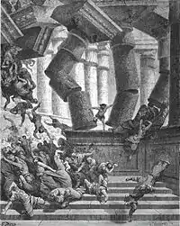 استخدم المصطلح اسم شمشون الذي وردت عنه إشارة في الكتاب المقدس، حيث قام شمشون بدفع أعمدة معبد فلستيُّون ما أدى إلى سقوط السقف فقتل نفسه مع آلاف الفلستيين الذين كانوا قد أسروه، [4] وكان يصيح حينها "دعوني أموت مع الفلستيين!" (Judges 16:30).[5]