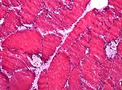![]() خزعة عضلية تظهر فجوات كبيرة في حالة داء بومبه (صبغة HE , مقطع مجمد). خزعة عضلية تظهر فجوات كبيرة في حالة داء بومبه (صبغة HE , مقطع مجمد). | |