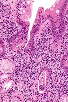 ![]() صورة مجهرية showing strongyloidiasis; a fragment of a worm is seen in the lower right hand corner. صبغة الهيماتوكسيلين واليوزين. صورة مجهرية showing strongyloidiasis; a fragment of a worm is seen in the lower right hand corner. صبغة الهيماتوكسيلين واليوزين. | |