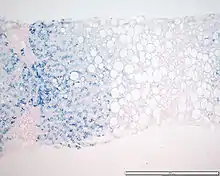 خزعة الكبد يعنى بها أخذ عينة من أنسجة الكبد، وذلك باستخدام إبرة رفيعة. وبمقارنة كمية الحديد في العينة بالمستوى الطبيعى له نستدل على مدى تلف الكبد وبالأخص تليفها، الفحص المجهري. في السابق كان الفحص المجهري الطريقة الوحيدة المستخدمة في تأكيد تشخيص الأصباغ الدموي ولكن حاليا قياس الترانسفيرين والفيرتين ومعرفة التاريخ الوراثي للمريض يعتبران كافيان لوجود العلة. ومخاطر الخزعة تتمثل في الكدمات والنزيف والإصابة بالعدوى. وعندما اتضح الآن أن التاريخ الوراثي للمريض وقياس الترانسفيرين والفيرتين يعطيا تثخيص مقبول لمرض الأصباغ الدموي الشاذ. أصبح أخذ خزعة الكبد أمر مختلف عليه ما إذا كان ضروري أو غير ضرورى لتحديد كمية الحديد المتراكم في الجسم.