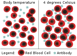 تربط الأجسام المضادة (وبوجهٍ عام الكريين المناعي م)، في درجات حرارة الجسم ما بين درجة حرارة 28-31 مئوية مثل التي نواجهُها خلال شهور الشتاء وأحيانًا في درجة حرارة الجسم 37 درجة مئوية، ناحية عديد السكاريد للبروتينات السكرية بسطح خلايا الدم الحمراء (وهي في العادة المستضد I والمستضد i والمستضادات Pr). ويُنشِّط ربط الأجسام المضادة بخلايا الدم الحمراء من المسار التقليدي للجُملة المُتمِّمة أو ما يُعرف باسم نظام المتممة، فإذا كانت الاستجابة المتممة كافية، سيدمر مُعقد مهاجمة الغشاء خلايا الدم الحمراء وهو عبارة عن مُستفعِل لتسلسل المتممة. وأثناء تكوين مُعقد معالجة الغشاء، تدخل العديد من البروتينات المتممة في غشاء خلية الدم الحمراء مُكوِّنةً مسامًا تؤدي إلى عدم استقرار الغشاء وانحلال الدم داخل الوعاء (إفساد خلية الدم الحمراء داخل الأوعية الدموية).