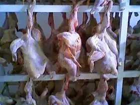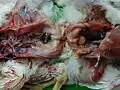 ![]() أعراض نزف داخل-عضلي نتيجة لداء الغومبورو واضحة على الدجاجة في الوسط. | |