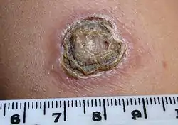 ![]() قرحة داء الليشمانيات الجلدي عند طفل من الشرق الأوسط. قرحة داء الليشمانيات الجلدي عند طفل من الشرق الأوسط. | |