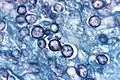 ضمن اليبلوع فالفطر لديه حاجة مطلقة لإلثيامين.[12] والمناعة الخلوية للنوسجات تتطور في غضون أسبوعين. إذا كان المريض لديه مناعة خلوية قوية، فإن الخلايا بلعمية، والخلايا الظهارية والخلايا اللمفية تحيط بالكائنات الحية، وكلس في نهاية المطاف. في الأفراد الفاقدين للمناعة، وتقوم هذه الكائنات بنشرها إلى أجهزة مختلفة مثل العظام والطحال والكبد والغدد الكظرية والأغشية المخاطية الجلدية، مما أدى إلى انتشارها بالتدريج، مرض الرئة المزمن يمكن أن يظهر في بعض الحالات.