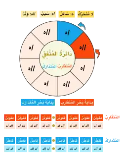 - إذا ابتدأت من السبب الأول (أي /ه) إلى إتمام الدائرة (عكس عقارب الساعة)، تتحصل على تفعيلات شطر بحر المتدارك، وهي: فَاعِلُنْ فَاعِلُنْ فَاعِلُنْ فَاعِلُنْ، فيكون بذلك وزن البحر: